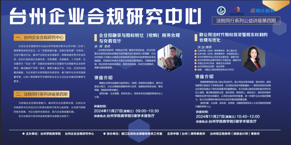 【讲座预告】台州企业合规研究中心法税同行系列公益讲座第四期