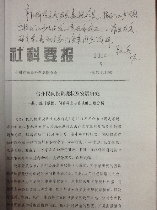 我校经贸管理学院刘际陆博士、蒋俊贤博士等完成的2014年台州哲学社科规划重大委托课题《台州民间投资发展研究》(课题编号:14FGHW01),研究成果经台州市社科联第113期《社科要报》提交台州市委副书记、市长张兵审阅后,得到了重要肯定,并作出了“市社科联这份研究数据详实,揭示了不少问题,也提出了不少有价值的意见和建议。请发改委、研究室等相关部门负责同志阅研”的亲笔批示。