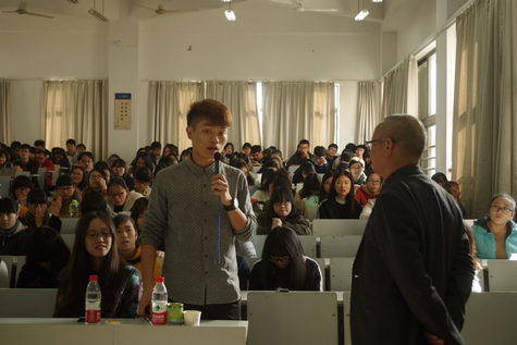 杨国飞校友以红石梁集团的创业历程为例,全面分析了当代大学生面临的毕业选择和就业问题以及创业的必备条件,并将自己的创业理念归纳为“五个一”:一个最简单的问题,一个最好的时代,一个坚实的创业平台,一个有趣的创意故事,一次机不可失的众创机会。报告中,他专门探讨了众筹、众创等相关概念,让同学们受益匪浅。其间穿插的有奖问答环节更是将现场热烈氛围推向高潮,同学们积极参与,踊跃发言,偌大的阶梯教室座无虚席,洋溢着同学对创新创业的热情。