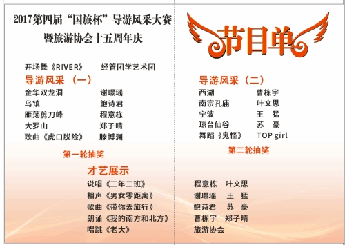 经过层层筛选,共有8位参赛选手进入了总决赛。导游风采展示参照导游证面试环节,每一位选手针对特定景点准备解说词,谢璟瑶选手的《金华双龙洞》、程意栋选手的《雁荡剪刀峰》、曹栋宇选手的《西湖》等等,精彩的解说让现场观众足不出户体验了一把全省八大知名景点的魅力。优秀的才艺表演是每一个导游的基本功,郑子晴的朗诵《我的南方和北方》、苏豪的歌曲《带你去旅游》将晚会现场推向了高潮。经过激烈的角逐,曹栋宇获得本次大赛的冠军,郑子晴、王猛分别获得第二名、第三名。