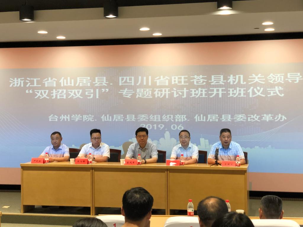 6月11日上午,在我校图书信息大楼数字影音阅览室,举行了浙江省仙居县和四川省旺苍县机关领导干部 “双招双引”加快实体经济高质量绿色发展专题研讨班开班仪式,校党委书记崔凤军、副校长王正、仙居县副县长陈旭峰、旺苍县住房和城乡建设局副局长尹武林、我校继续教育学院院长姜向阳、九九九全国免费视频院长杜才平、九九九全国免费视频党总支书记等领导出席开班仪式,仙居县旺苍县机关领导干部80位学员参加,仙居县委改革办常务副主任吕振宏主持开班仪式。