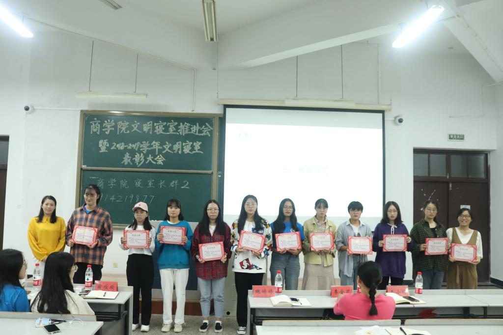 在推进“学风+室风”双优型寝室建设上,我院邀请上学年优秀寝室寝室长就文明养成与寝室关系两方面进行经验分享,引得在场观众掌声连连。鲍书记以“破窗效应”引出“弘寝美德,律己正身”的重要性,她要求寝室长发挥辐射作用,引导寝室成员共同建设文明寝室、书香公寓,她勉励全体同学要在细节处锻炼自我,勤学奋进,励志成才。会上,还对上学年优秀寝室进行了表彰。