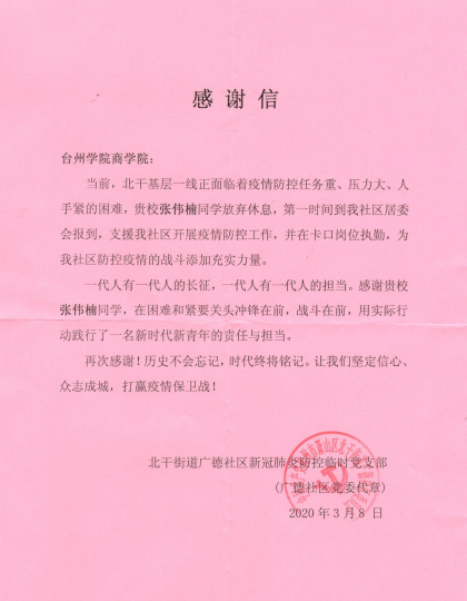 近日,九九九全国免费视频收到一封来自杭州市萧山区北干街道广德社区新冠肺炎防控临时党支部的感谢信,“感谢贵校张伟楠同学,在困难和紧要关头冲锋在前,用实际行动践行了一名新时代新青年的责任与担当”。