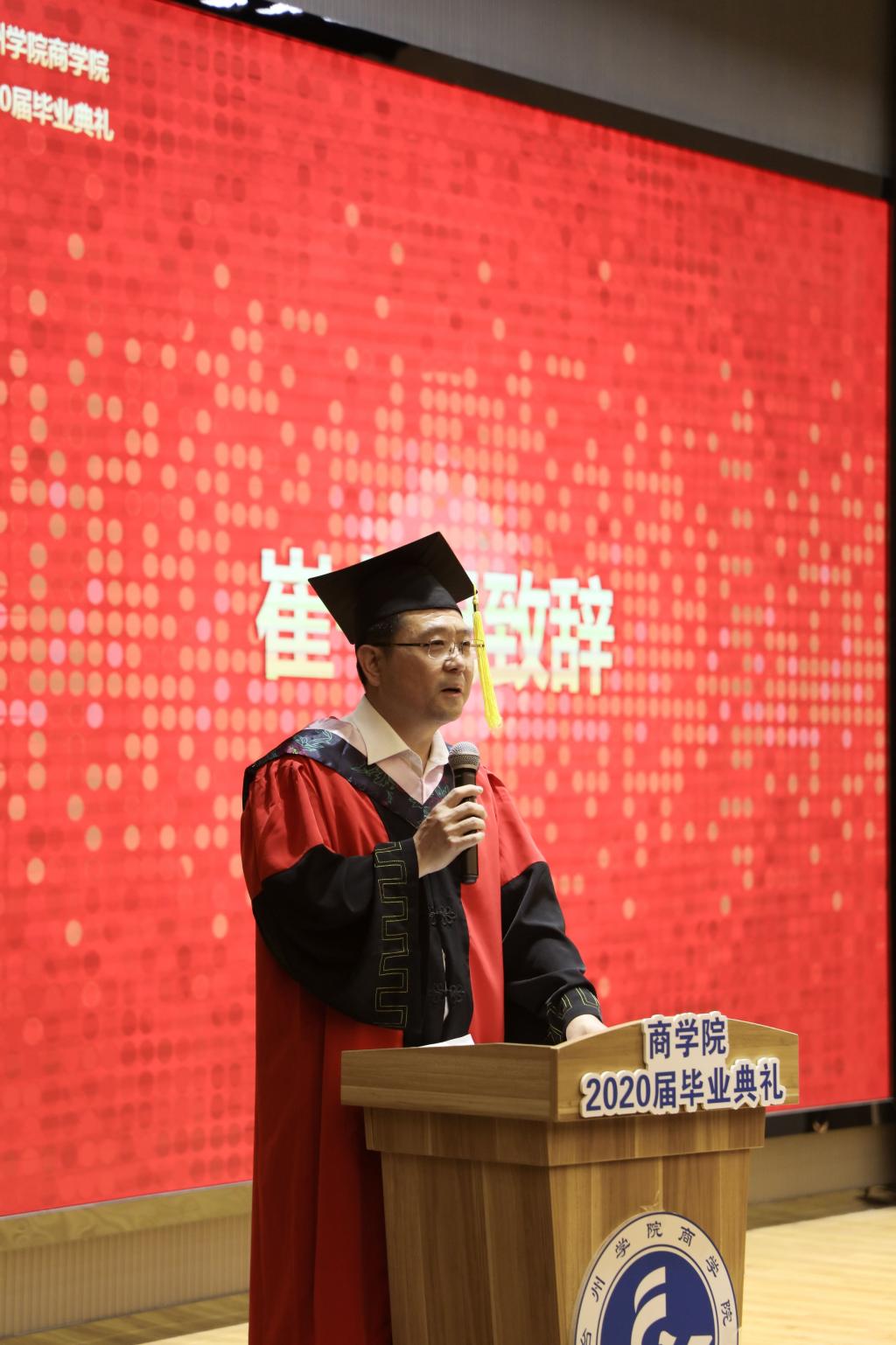 崔凤军书记作毕业致辞,他以小王子中的经典语段为开头,以古往今来的经典送别诗文为载体,向大家传达了自己的不舍之情和对毕业生即将载梦远航的美好祝愿。同时,他向全体毕业生们提出三点希望:学会自信,肯定自我独特优势,永远充满热情;学会自律,在绚烂中保持冷静,在喧嚣中听从内心;学会自强,不惧前路漂泊与艰辛,奋力拼搏,始终如一。并以一句慷慨激昂的“愿归来依然少年”作结,道出了“一日台院人,一生台院情”的赤子之心。最后,在温馨的毕业短片后,崔凤军书记与优秀毕业生代表一起登场倾情演唱《朋友》,为全体毕业生送别,崔凤军的深情嘱托和真挚祝福掀起整个毕业典礼的高潮。