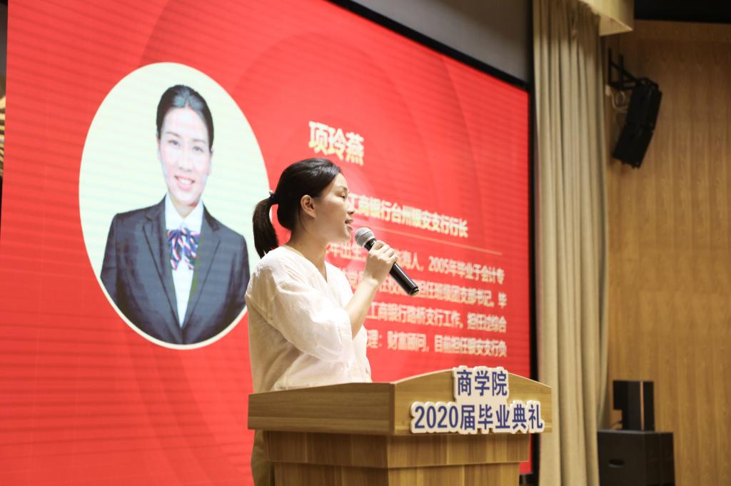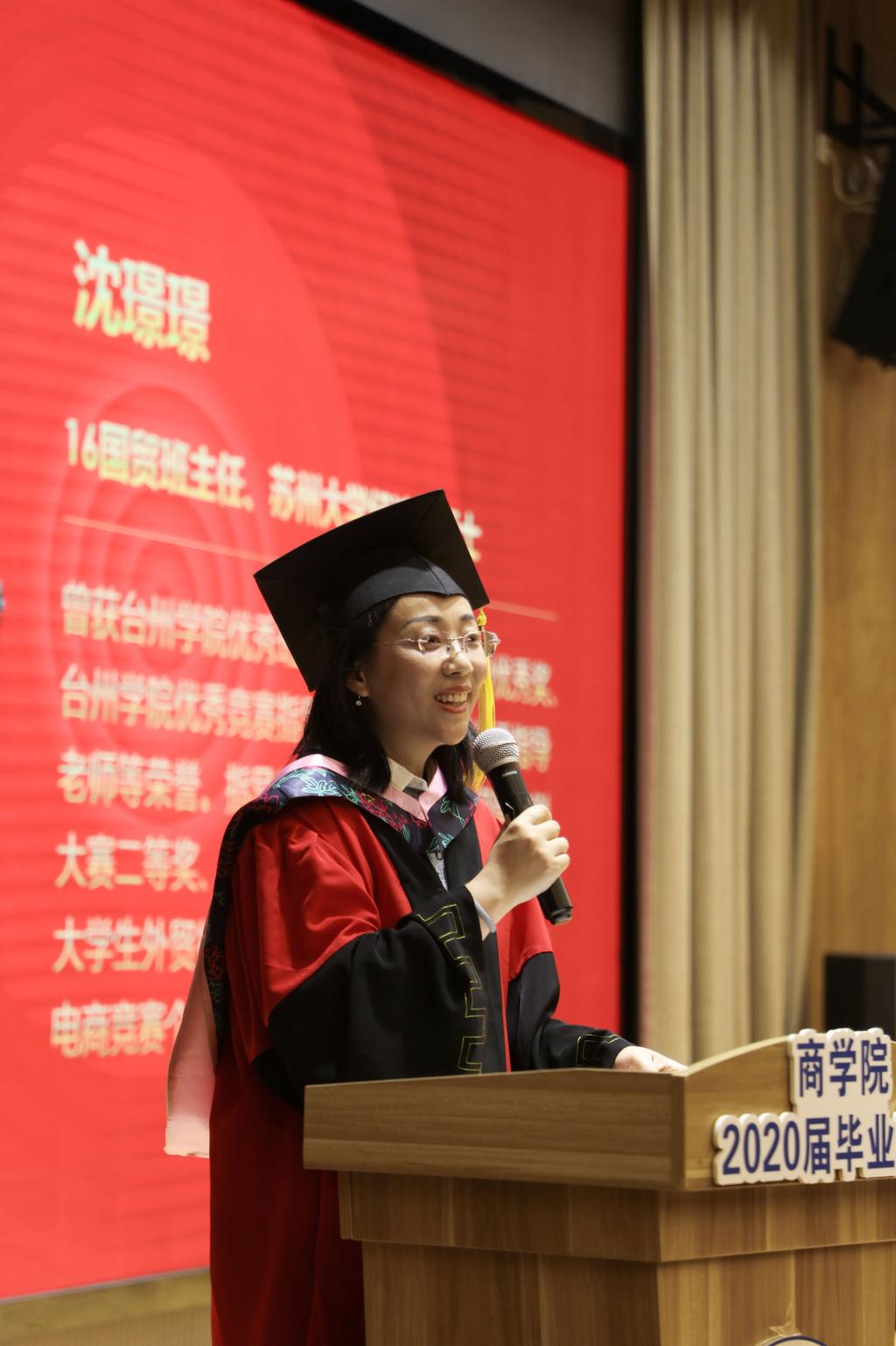 明朝即长路,惜取此时心。优秀毕业生代表16工商叶慧上台发言,感叹时光荏苒,表达临别不舍,祝福毕业生们实现人生梦想。16国贸班主任沈璟璟作为班主任代表作临行话别,她通过分享优秀学生的案例事迹勉励毕业生,希望同学们在未来能不忘初心、脚踏实地,不以物喜、不以己悲。校友代表02会计团支书项玲燕介绍该班建立校友基金资助贫困学子的初衷与过程,与同学交流、共话成长。