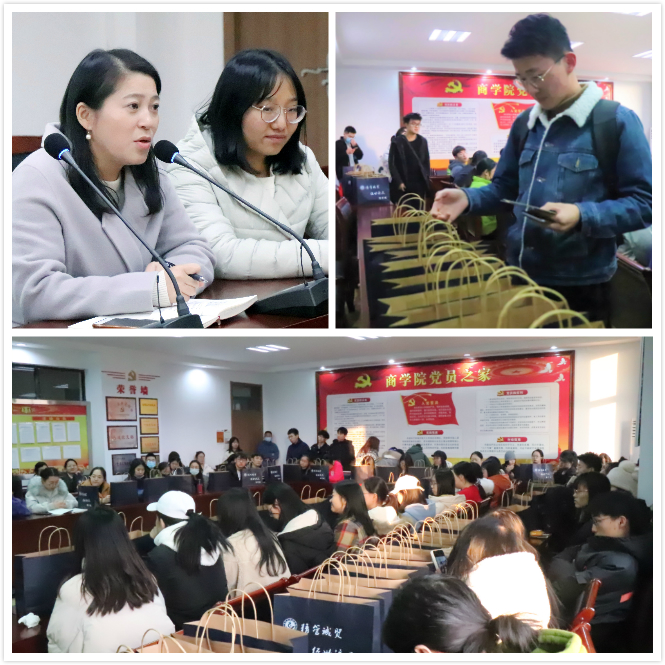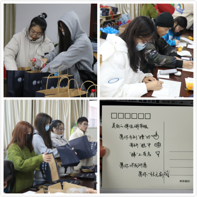 大会之前,考研学子陆续领取考研大礼包和饱含祝福的明信片,感受到来自学院深切的关怀。每一个考研大礼包里的物品,都由学院经过精心的挑选,蕴含独特的寓意;每一张写有考生姓名的明信片,字里行间都透露出学弟学妹真挚的祝愿。大会伊始,徐建伟老师详细介绍了考研大礼包与明信片的深刻寓意,表达了学院对考研学子的鼓励与期盼。随后,赵之遐老师以亲切和蔼的言语分享考研的技巧,减轻了考研学子的压力。接下来,鲍婷婷指出学院对考生的大力支持,提出对考研学子“仰望星空,脚踏实地”的劝勉,鼓舞考生冲刺向前。最后,大会以鲍书记“马到成功,考研高中,榜上有名”的诚挚祝福作结。