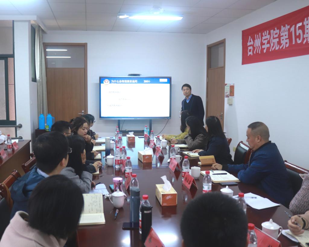 郑敏以“信息网络安全交流”为题作讲座指导,他围绕“网络安全背景形势”、“网络安全基本常识和案例”及“网络安全防护基本技能”三个方面,分析了当前国内外及台州市内的网络安全现状。结合典型案例,相关法律法规介绍了“什么是网络黑客”“网络色情”及“什么是网络诈骗”“网络谣言”;重点围绕网络刷单、网络购物退款、短信类诈骗、助学金诈骗、“校园贷”诈骗、“杀猪盘”诈骗、“跑分”骗局等大学生常遇诈骗套路作了细致的分析,就提高当代大学生防范意识,提出预防网络诈骗“三个不”——不轻信、不透露、不转账。