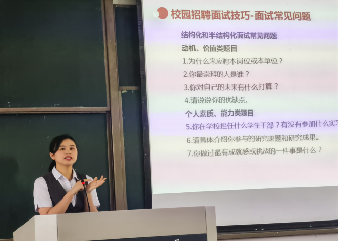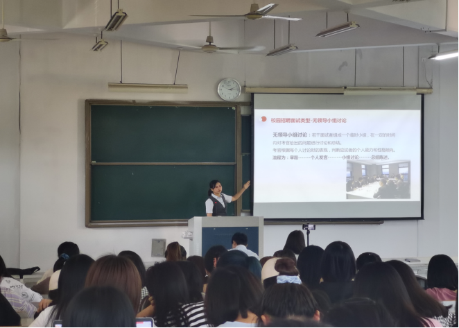 潘恒女士结合日常招聘工作实际,围绕校园招聘的类型、笔试题型、面试类型、面试技巧四个方面展开,并对面试技巧进行了重点讲解。结合例题和视频案例,潘恒指出,在面试中,自我介绍要简明扼要;在无领导小组面试中,每个应聘者应当根据个人情况选择适合自己的角色;半结构化面试在校园招聘中采用较多,面试官会针对自己感兴趣的点进行细节提问,运用STAR法则可以让回答内容更丰富,要点更清晰。本次讲座基于HR视角讲解面试技巧,对于学生来说更具真实性、专业性,更有利于找寻自我提升方向,增强面试信心。