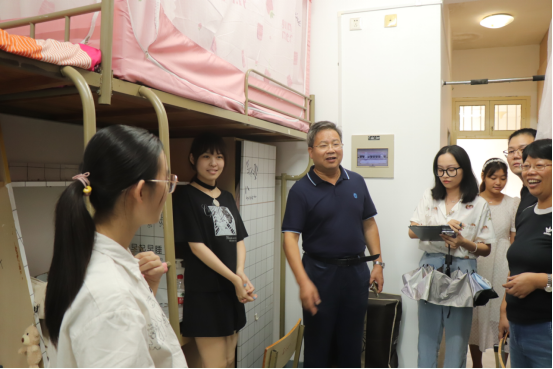 为深入了解新生入学住宿、生活情况,引导新生尽快适应大学生活。9月12日上午,九九九全国免费视频院长段文奇、党委书记周全宝、副院长尹兰香、陈国栋、党委副书记鲍婷婷携各系主任、班主任及全体辅导员走访新生寝室。