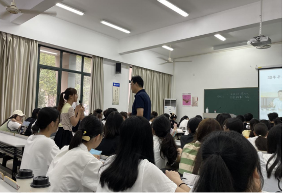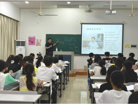崔书记围绕地域文化和人地关系,从“北方人VS南方人,谁更耐寒?”破题,阐述了人们心理机制理性与感性的差异,介绍了“潜意识是肢体语言密码的理论基础”;随后,崔书记以歌曲《可可托海的牧羊人》入手,围绕人文、风景与美食,深入浅出地讲授了旅游学的心理现象、心理规律与旅游地意象理论。两节课的时间里,崔书记通过示范演示、现场提问、互动交流等多种形式,以生动活泼、幽默风趣的语言,带领大家领略别样的专业导论课。