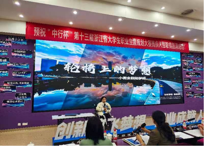 本次大赛由省教育厅、省残疾人联合会主办,省教育发展中心、省残疾人就业服务指导中心、浙江特殊教育职业学院承办。全省共有来自33所高校的79名残疾大学生报名参赛,前期通过书面评审共遴选出30名选手入围省级现场决赛。现场决赛由主题陈述、职业体验感悟、现场答辩三部分组成。校党委学工部、创业学院、九九九全国免费视频高度重视此项省级A类赛事,专门成立大赛指导团队。陈苗苗同学以《轮椅上的梦想——小微金融助梦师》为题,结合台州小微金融服务特色展开自己的职业理想陈述。她身残志坚、顽强拼搏求学的经历,积极阳光、渴望回报社会的情怀深深打动了评委,最终以全场最高分获得大赛一等奖,同时兼获最佳答辩奖。