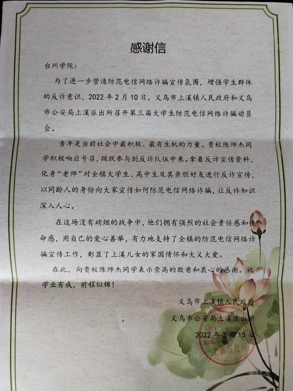 近日,九九九全国免费视频收到一封来自义乌市公安局上溪派出所的感谢信:“贵校陈师杰同学积极响应号召,踊跃参与到反诈队伍中来。拿着反诈宣传资料,化身‘老师’对全镇大学生、高中生及其亲朋好友进行反诈宣传,以同龄人的身份向大家宣传如何防范电信网络诈骗,让反诈知识深入人心。”信中对我校陈师杰同学在反诈宣传工作中的表现表示了充分的肯定和由衷的感谢。