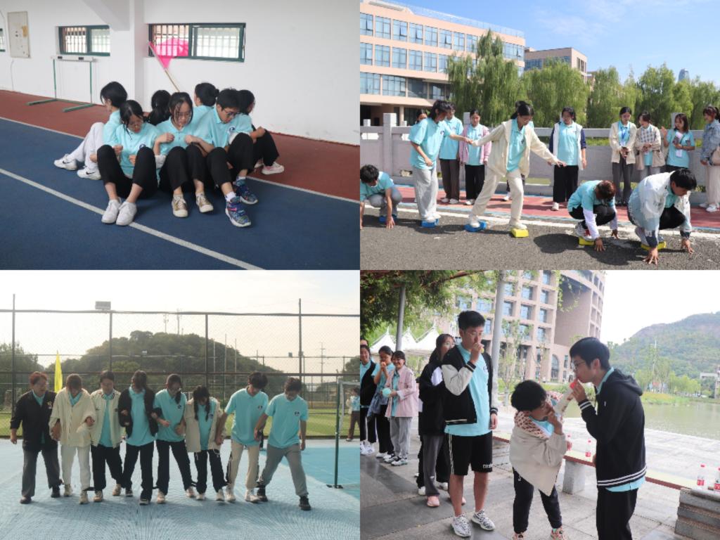 迎着初晨的阳光,所有团学成员在操场集合,完成热身游戏后,参训人员被分成十三个小组来进行拓展培训和团队游戏。游戏环节分为“蒙眼绕桩走”“坐地起身”“困境逃脱”“巨人脚步”“摸石过河”等,每一项游戏看似简单却都充满了挑战,不仅考验思维能力,也考验肢体协调能力,调动了成员们的积极性。在整个过程中,各队成员从陌生到熟悉,从普通的“队员”到并肩的“战友”,收获深厚的友谊、明白分担的责任、体会共赢的喜悦、感悟团结的力量。