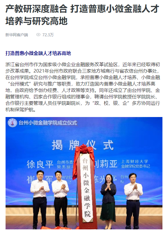 台州学院还与上海财大金融学院、人大普惠金融研究院、浙大金融研究院、厦大信用大数据与智能风控研究中心、浙江省知名高校等,共同组建研究团队,聚焦小微金融与区域共富、小微金融“台州模式”推广等领域开展科研攻关,为台州创建小微企业金融服务改革创新示范区、推动民营经济高质量发展、加快小微金融“台州模式”推广献计献策。