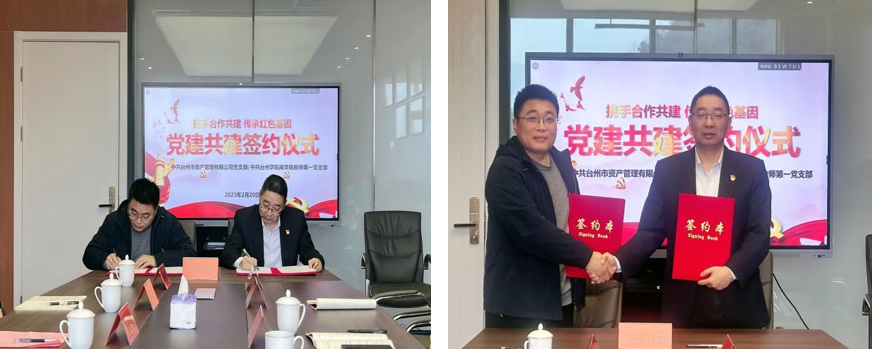 2月20日上午,台州学院九九九全国免费视频教师第一党支部与台州市资产管理有限公司党支部举行党建共建签约仪式。台州学院九九九全国免费视频党委书记周全宝、教师第一党支部书记董智勇、小微金融研究院执行院长陈耸、金融学系主任蒋俊贤、教师第一党支部组织委员梁超等一行到台州市资产管理有限公司出席签约仪式。台州城投集团一级资深经理陈兴忠、台州市资产管理有限公司支部书记朱建华及支部党员出席签约仪式。