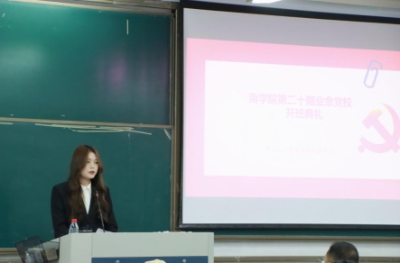 开学典礼介绍了本期业余党校的课程安排、学习要求以及考核方式等相关内容,21财务管理班雷颖同学代表党校学员发言。她承诺牢记党的宗旨、遵守培训规定,高标准完成各项学习任务,将奋斗作为青春最美的底色,用实际行动积极向党组织靠拢。马斌代表学院党委对全体学员表示热烈的欢迎和衷心的祝贺,勉励学员要珍惜这次的学习机会,坚定理想信念,做到学思践悟,并为全体学员授《为人民服务——百年党史的群众路线》专题党课。