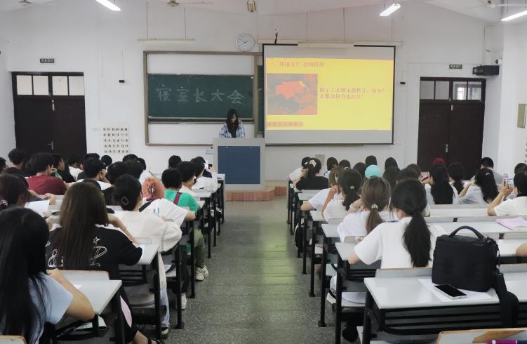会上,李佳丽同学对新学期寝室卫生检查标准进行讲解,强调具体扣分细则和内务整理要求,希望寝室长们能够督促寝室成员做好寝室卫生工作。随后,李佳丽同学又对寝室的用电规范作出了详细说明,强调使用违规电器的危害,严禁私拉乱接电线和各种违规用电行为,号召同学们养成人走即断电的好习惯。此外,围绕特色寝室、文明寝室的创建,李佳丽同学向大家分析了相关评选规则,并强调评选结果对学生综合素质考评的重要性,最后,针对大一新生寝室长,纪检部成员也细心讲解了晚归打卡制度,呼吁各位寝室长主动承担起职责,多关心、帮助室友,有特殊情况时立即上报老师。