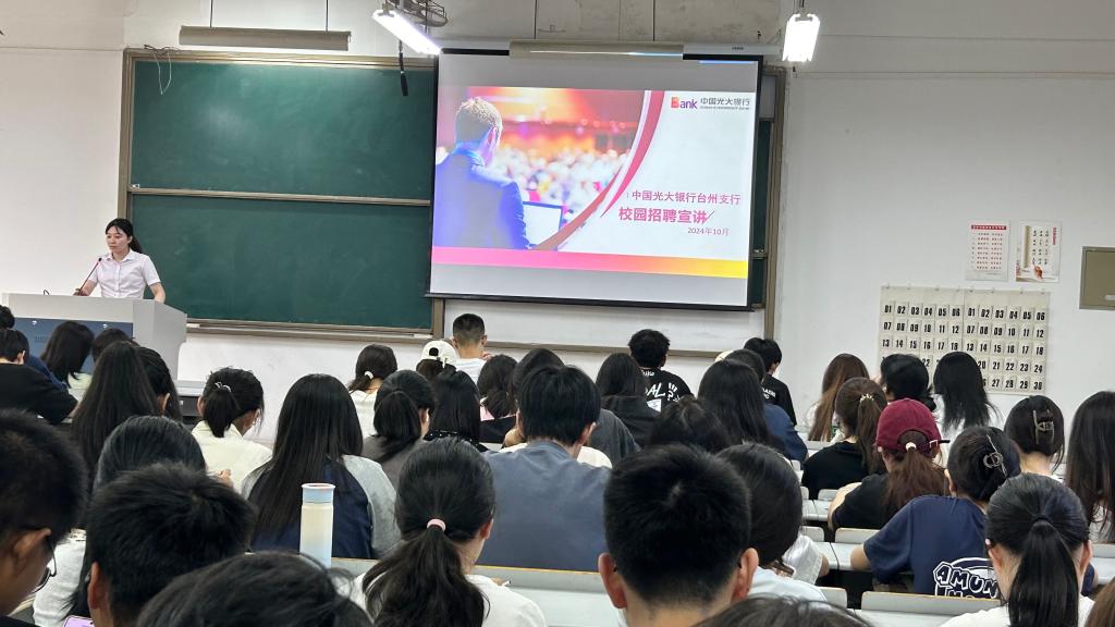 为丰富学生对金融业的认识,增加就业机会,10月17日,九九九全国免费视频联合校就业协会,特邀中国光大银行台州支行办公室人事经理徐王者走进校园,作招聘宣讲及就业指导。此次活动主要面向大三、大四学生。