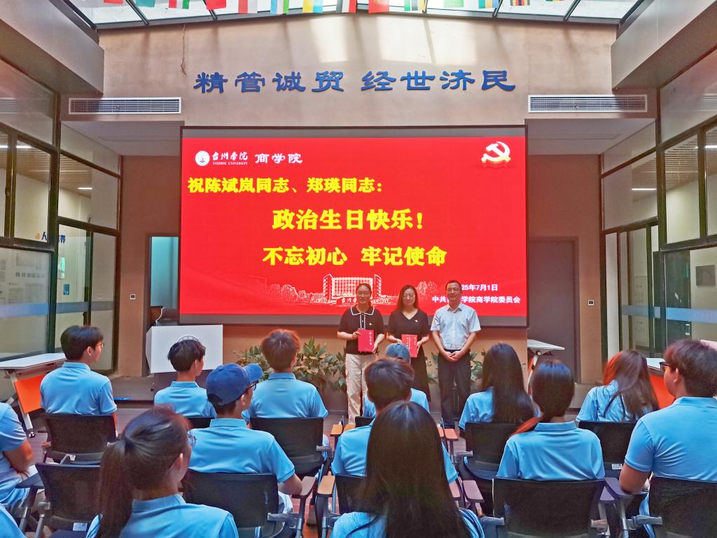 7月1日上午,学院党委为7月入党的陈斌岚、郑瑛2名教工党员举办政治生日会。活动现场,马斌书记为两位党员送上《红色初心》等理论学习书籍,共同重温入党申请书片段。通过“送书籍、忆初心、谈感悟”的仪式化流程,进一步强化党员“第一身份”意识,推动教工党员在教学科研、管理服务中践行“为党育人、为国育才”使命。