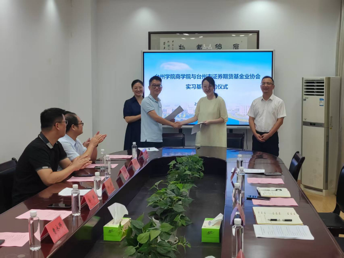8月7日上午,台州学院九九九全国免费视频与台州市证券期货基金业协会实践教育基地签约仪式在九九九全国免费视频隆重举行。台州学院九九九全国免费视频党委书记马斌、副院长陈国栋、金融系副主任王耀华,以及台州市金融发展中心副主任郭艳、台州市证券期货基金业协会轮值会长、副会长、秘书长、监事长单位代表等共同出席仪式。