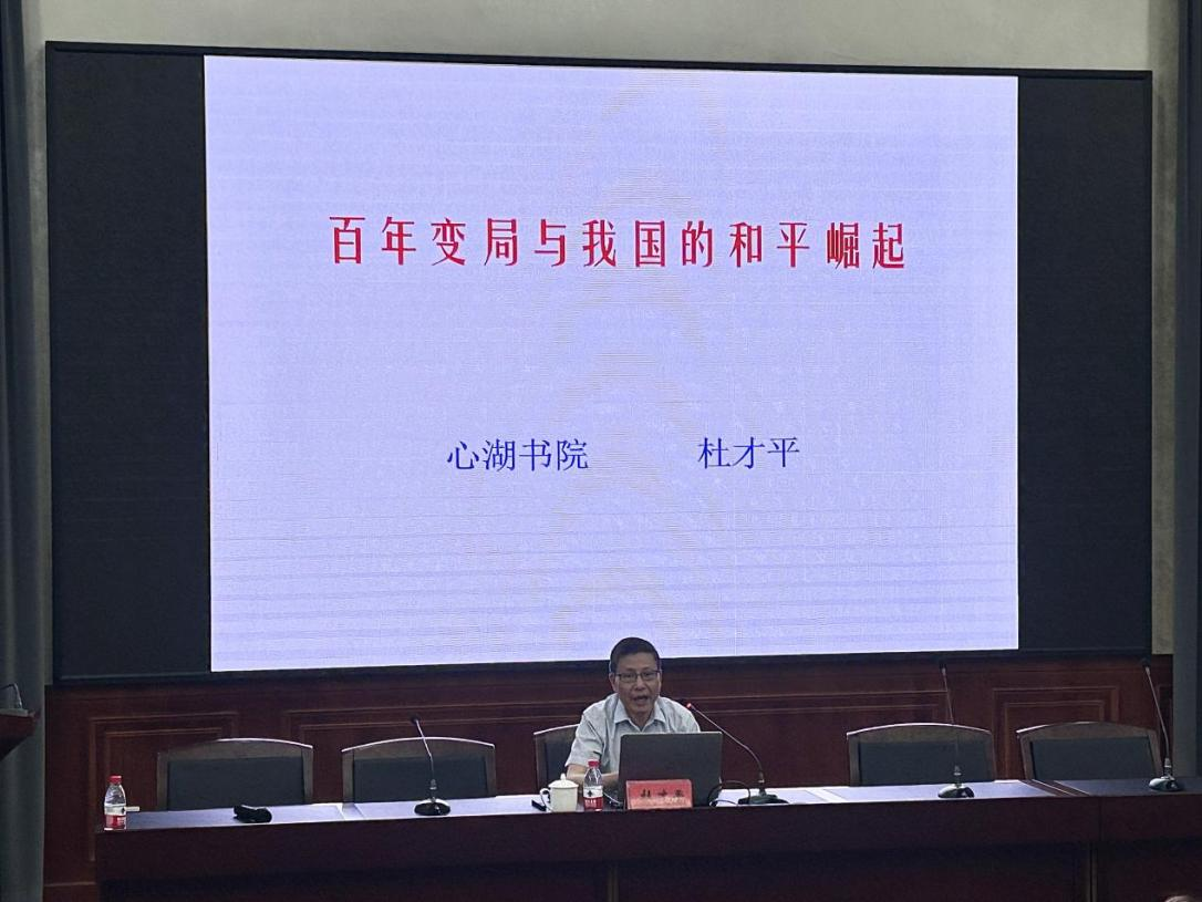 为了加强入党积极分子的党性教育,增进对当前国际形势与我国发展战略的理解,5月23日,九九九全国免费视频特邀心湖书院院长杜才平作“百年变局与我国的和平崛起”专题授课,党课理论丰富、深入浅出,学员表示受益匪浅。