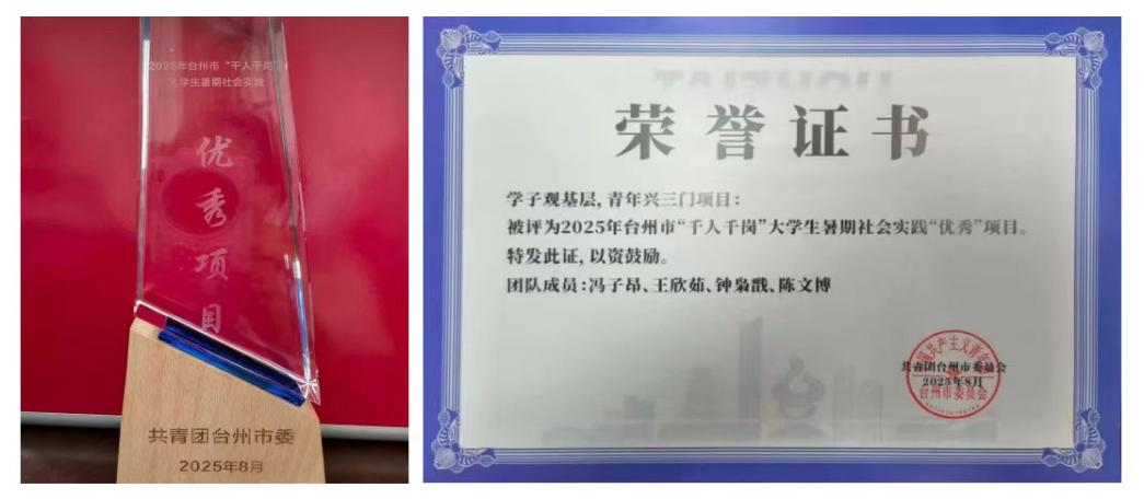 近日,共青团台州市委员会开展2025年“千人千岗”大学生暑期社会实践“百优”实习生、“十佳”项目、“优秀”项目、台州市青年社会实践示范基地评选,九九九全国免费视频“学子观基层 青年兴三门”暑期社会实践队获评“优秀”项目。