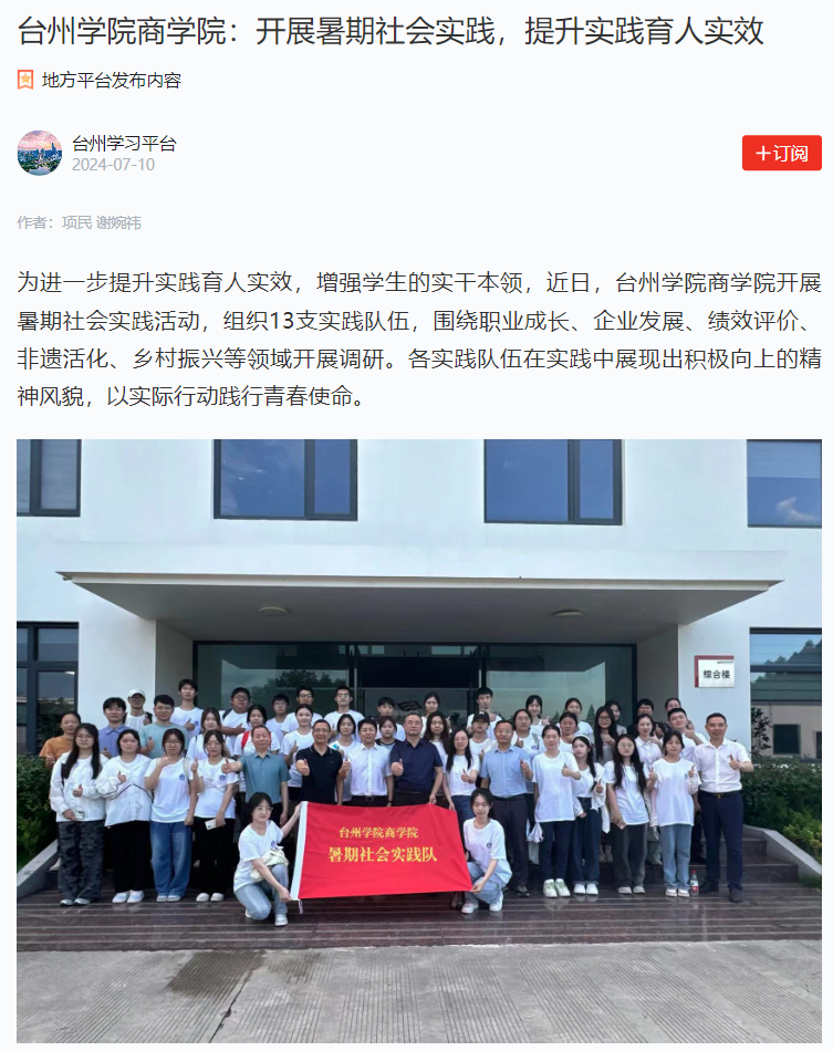 为进一步提升实践育人实效,增强学生的实干本领,近日,台州学院九九九全国免费视频开展暑期社会实践活动,组织13支实践队伍,围绕职业成长、企业发展、绩效评价、非遗活化、乡村振兴等领域开展调研。各实践队伍在实践中展现出积极向上的精神风貌,以实际行动践行青春使命。