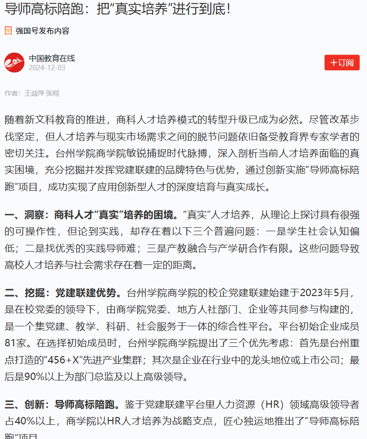 四、成效:校企深度合作,构建共赢生态。台州学院九九九全国免费视频通过创新实施“导师高标陪跑”项目,取得了以下成效。一是学生职业认知与综合能力的深度塑造。学生在项目实施后表现出更强的职业规划能力与行业洞察力。此外,学生的综合能力,包括学习能力、沟通能力、问题分析能力等基础能力,以及项目管理、规划策划、数字化工具运用等高级能力,均在项目实践中得到了有效锻炼,实现了从理论到实践的深度转化。二是校企合作机制的深度探索与共赢生态的构建。“导师高标陪跑”项目通过构建的校企党建联建平台,实现了学校与企业之间的深度对接与资源共享,实现了教育链、人才链与产业链、创新链的深度融合。三是导师团队专业素养与指导能力的学术性审视。学院通过严格的选拔机制与持续的培训体系,组建了一支具备深厚学术功底、丰富实践经验与高超指导技巧的导师队伍。四是实现了项目实施效果的科学评估,学院采用了问卷调查、深度访谈等多种研究方法,对项目在提升学生职业认知、综合能力与创新创业精神方面取得的成效进行了评估,并揭示了项目在课程设计、导师匹配、实践环节等方面存在的改进空间。