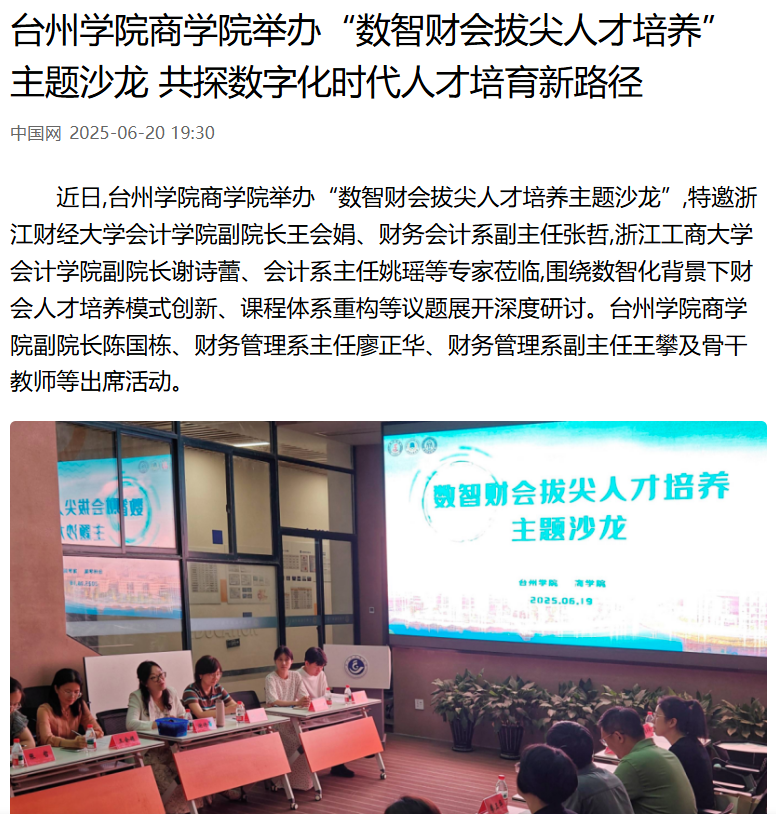 近日,台州学院九九九全国免费视频举办“数智财会拔尖人才培养主题沙龙”,特邀浙江财经大学会计学院副院长王会娟、财务会计系副主任张哲,浙江工商大学会计学院副院长谢诗蕾、会计系主任姚瑶等专家莅临,围绕数智化背景下财会人才培养模式创新、课程体系重构等议题展开深度研讨。台州学院九九九全国免费视频副院长陈国栋、财务管理系主任廖正华、财务管理系副主任王攀及骨干教师等出席活动。智能财务转型:从课程改革到实践落地的探索
