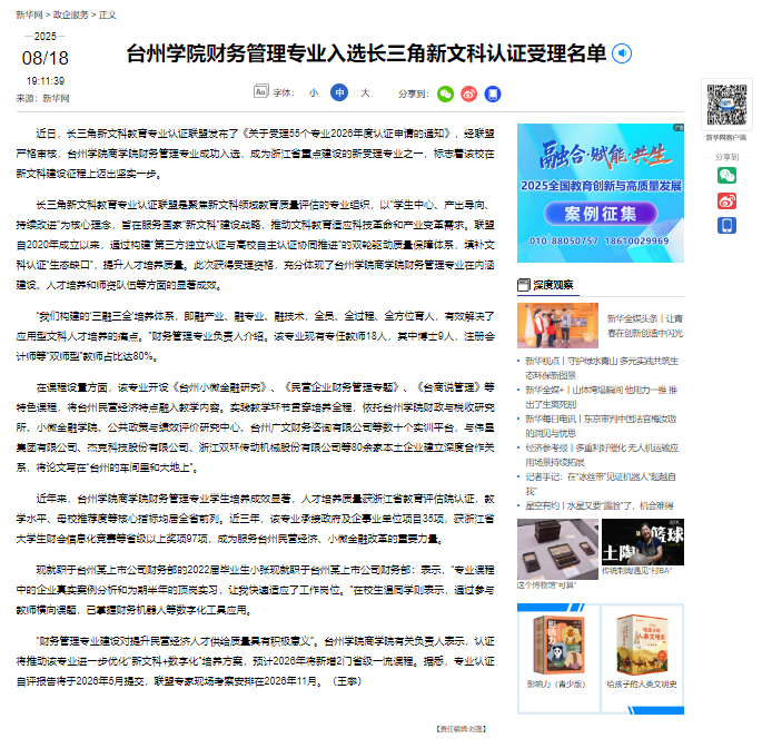 媒体聚焦|台州学院财务管理专业入选长三角新文科认证受理名单