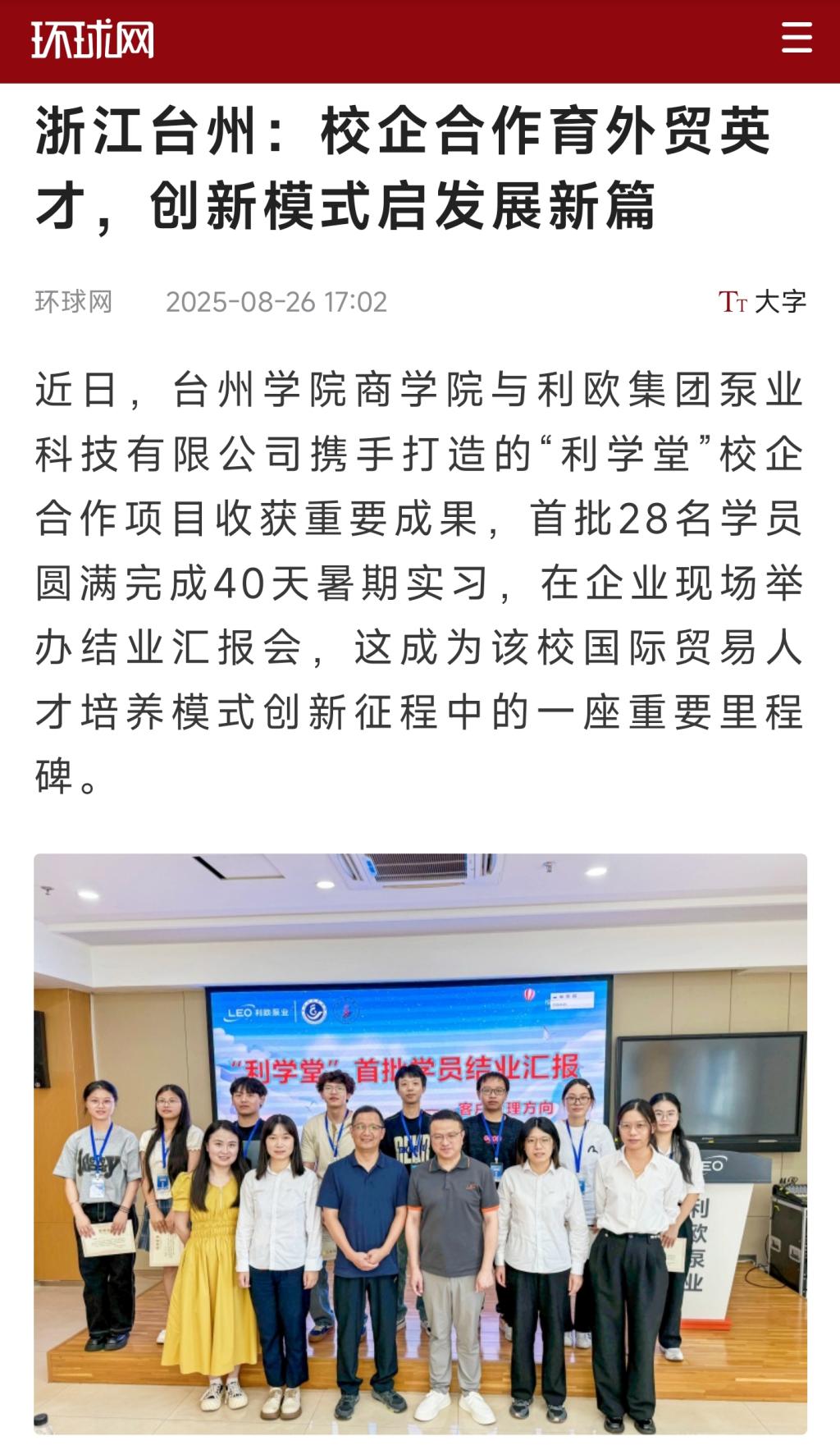 近日,台州学院九九九全国免费视频与利欧集团泵业科技有限公司携手打造的“利学堂”校企合作项目收获重要成果,首批28名学员圆满完成40天暑期实习,在企业现场举办结业汇报会,这成为该校国际贸易人才培养模式创新征程中的一座重要里程碑。