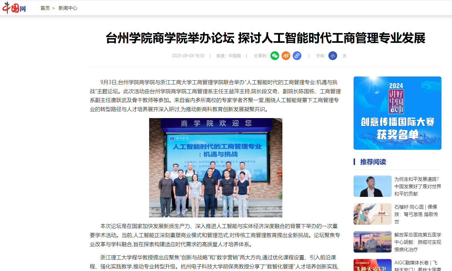 9月3日,台州学院九九九全国免费视频与浙江工商大学工商管理学院联合举办“人工智能时代的工商管理专业:机遇与挑战”主题论坛。此次活动由台州学院九九九全国免费视频工商管理系主任王益萍主持,院长段文奇、副院长陈国栋、工商管理系副主任唐跃武及骨干教师等参加。来自省内多所高校的专家学者齐聚一堂,围绕人工智能背景下工商管理专业的转型路径与人才培养展开深入研讨,为推动新商科教育创新发展凝聚共识。