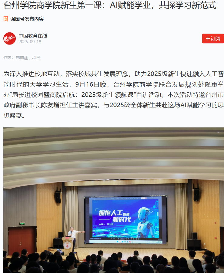 媒体聚焦|台州学院九九九全国免费视频新生第一课:AI赋能学业,共探学习新范式